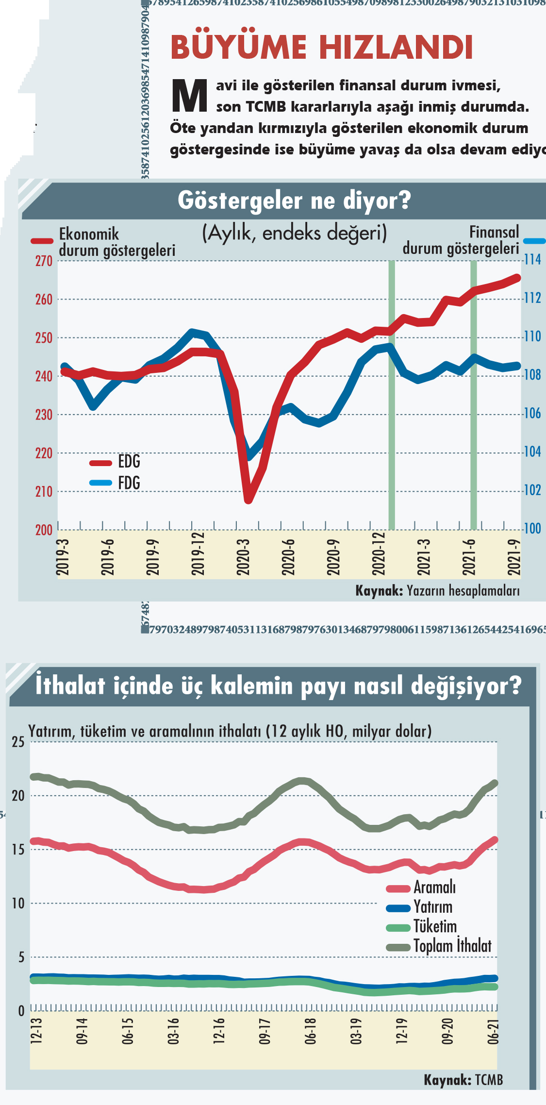 Yazılarımızda ekonomik ve finansal kesimdeki aylık durumu, en son açıklanan veriler yardımıyla gerçek zamanlı olarak hesapladığımız göstergelerle paylaşıyoruz. Bu göstergelerin 2019 yılından bu yana gelişimini Kutu 3’de gösterdik. Bu ayki hesaplamalarımıza gelince… Finansal durum göstergesi, ekim ayında bir önceki aya göre yüzde 0,17 azaldı. Eylül ayında ise bu düşüş yüzde 0,31 seviyelerindeydi. Finansal koşullardaki TCMB’nin çekirdek enflasyon açıklamasından sonra ağustos sonlarından itibaren başlayan kötüleşme eylül ve ekim aylarındaki faiz indirimleriyle devam etti. Yaşanan bütün bu faiz şoklarından sonra kötüleşmenin devam etmesini bekliyoruz. Üstelik önümüzdeki günlerde dışsal faktörler de bizim yararımıza seyretmeyecek gibi görünüyor. Grafikte de bu kötüleşmenin başlangıcını, en son Mart 2021’de yaşanan sarsıntıyla birlikte gösterdik. EKONOMİK KOŞULLARDAKİ DEĞİŞİM Ekonomik durum göstergesine baktığımızda ise ekim ayında bir önceki aya göre yüzde 0,37’lik bir büyüme öngörüyoruz. Eylülde bu oran yüzde 0,32 olarak gerçekleşti. 2021 3’üncü çeyreğinde 2’nci çeyreğe göre yüzde 2,13’lük bir büyüme öngörüyoruz. Öte yandan 2021’in 3’üncü çeyreğinde 2020’nin 3’üncü çeyreğine göre büyümeye baktığımızda, bu durum yüzde 6,9’luk bir büyümeye dönüşüyor. Bu yüksek büyüme performansıyla birlikte finansal koşullarda yaşanan çalkantıdan dolayı ekonominin durgunluğa girme olasılığı önceki ay hesapladığımız yüzde 5’lik olasılıktan yüzde 8’e yükselmiş durumda. Kutu 4’te bu olasılıkların zaman içinde gelişimini bulabilirsiniz.