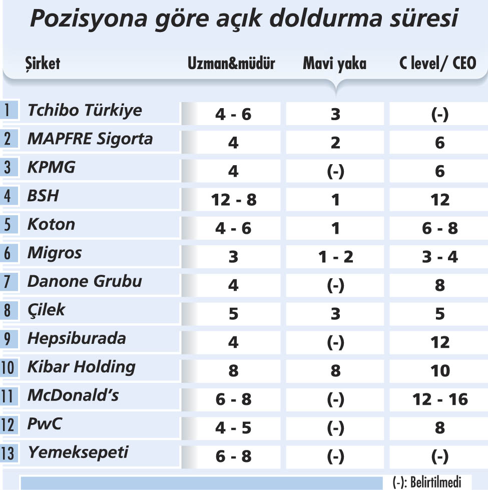 Çok fazla sayıda adaydan iş başvurusu alan şirketler, mevcut konjonktürde açık pozisyonları ortalama 1 ila 2 ay arasında kapatıyor. Mavi yakada bu süre bir haftada gerçekleşiyor. Bu yıl 5 bin 500 kişiyi istihdam etmeye hazırlanan Migros’da da uzman ve yönetim kademelerinde açık pozisyonlar en fazla 3-4 haftada dolduruluyor. Yılda 2 bin kişiyi istihdam eden Koton’da ise uzman ve üstü kademelerinde boş pozisyonlar ortalama 1-2 ay içinde kapatılıyor. Yılda 200 bin iş başvurusu alan Hepsiburada’da da giriş ve orta giriş seviyesindeki pozisyonlar 1 ayda kapatılırken, direktör ve üzeri seviyedeki üst düzey görevler için açık pozisyonu doldurma süreci 3 ayı buluyor. Hepsiburada İnsan Kaynaklarından Sorumlu İcra Kurulu Üyesi Mutlu Erturan, “Açık pozisyona doğru kişiyi yerleştirmek için gereken süre 1 ila 2 ay arasında değişiyor” diyor. PwC’de boş pozisyona yeni çalışan ortalama 1-2 ayda bulunuyor. PwC Türkiye İnsan Kaynakları Lideri Sibel Eren, direktör ve müdür pozisyonlarını ortalama 2 ayda, uzman pozisyonlarını ise 4-5 haftada doldurduklarını belirtiyor. McDonald’s’da ise bu süre en fazla 2 ayı buluyor. McDonald’s Türkiye İK Direktörü Dr. K. Mehmet Büyükçolak, bazen bu sürenin 4-6 aya kadar uzayabildiğini belirtiyor. Tchibo’da da işe alım süreci 1-2 ayı geçmiyor. Tchibo Türkiye Genel Müdürü Tuba Yapıncak, “Merkez ofisteki uzman ve diğer beyaz yaka pozisyonlarımızı ortalama 4-6 hafta arasında, mağazalarımızda açılan pozisyonları ise 3 haftada dolduruyoruz” diyor. Yılda ortalama 20 bin iş başvurusu alan Mapfre Sigorta’da da CEO ve C kademelerde açık pozisyon 45 günde kapatılırken, müdür ve uzman seviyelerinde bu süre 1 aya kadar iniyor.