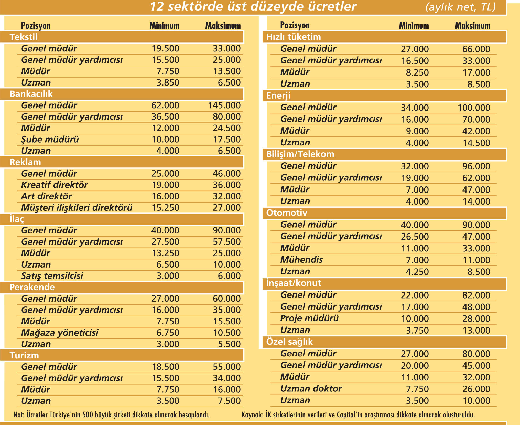 Yeni dönemin gerçeklerinin, sektörler arasında büyük farklılıkları azaltacağına yönelik beklentiler var. Ücret araştırmalarına göre sadece enerji, bilişim, perakende, petrokimya, savunma, madencilik ve metal sektörlerinde ortalamanın 2-3 puan üzerinde artışlar öngörülüyor. Oxygen Consultancy Genel Müdürü Zeynep Doğrul Aşa, dolar artışı ve ekonomik durgunluk nedeniyle önceki yıllarda sektörler arasında yaşanan ücret artış farklarının bu yıl kapanacağını söylüyor. 350 şirkete bordrolama hizmeti veren Datassist’in genel müdürü Ayşe Nazmiye Uça da 2018’de inşaat, bankacılık, bireysel emeklilik ve sigortacılık sektörlerinde geçmiş yıllara oranla daha düşük zam oranları bekliyor. “Bu sektörlerde yüzde 9’un altında zam oranları sürpriz olmayacak” diyen Uça’ya göre bilişimde yüzde 20’ler civarında zamlar muhtemel. İlaçta da enflasyonun altında artış bekleniyor. Mercer’ın ücret araştırması ise sadece otomotiv ve yan sanayi, dayanıklı tüketim, hizmet, maden ve metal, bankacılık ve finans ile perakende sektörlerinde 2018’de yüzde 9’un üzerinde artış öngörüyor. Aynı araştırmaya göre hızlı tüketim malları, yüksek teknoloji ve ilaç sektörleri toplam ödüllendirme içinde yan hak çeşitliliğinin fazla olduğu sektörler olarak öne çıkıyor.