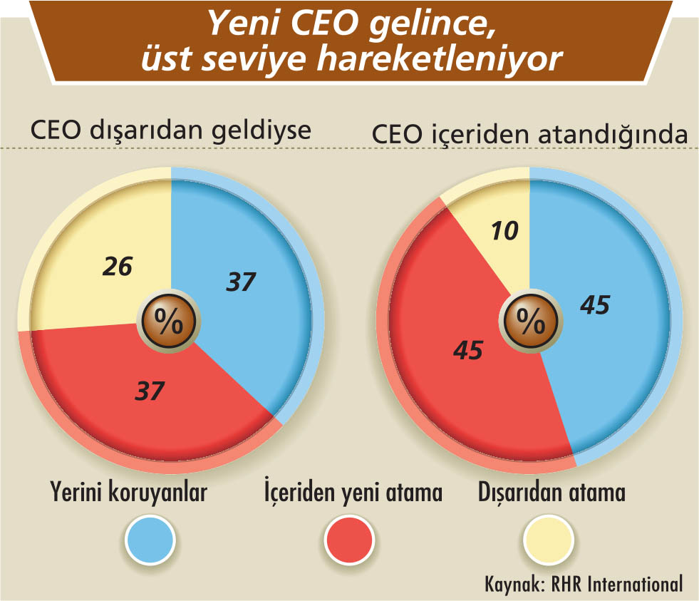 Heidrick & Struggles’ın “CEO Successions 2016” raporu, CEO değişiminin üst düzey yönetim kadrosuna etkisi üzerine çarpıcı veriler içeriyor. Araştırmaya göre, CEO ile birlikte en az 1 tepe yöneticisi daha değişen şirketlerin oranı 2013’te yüzde 23,8 iken, bu oran 2016’da yüzde 63,5’e yükseldi. ABD’nin en büyük 1.000 şirketini kapsayan başka bir araştırma, yeni CEO’ların yarattığı ekip değişimi hakkında ilginç veriler ortaya koyuyor. 2002-2004 yıllarını kapsayan araştırmaya göre, C seviyedeki sirkülasyon oranı, normal koşullarda yüzde 15 civarındayken, CEO değiştiğinde bu oran anlamlı biçimde yükseliyor. Hatta CEO içeriden geldi ise sirkülasyon oranı yüzde 17’ye, dışarıdan atandığında ise yüzde 25’e çıkıyor. 10 yıl öncesine dayanan bir başka araştırma (Coyne & Coyne, 2007) da benzer bir tabloyu ortaya koyuyor. Rapor, yeni CEO içeriden atandığında üst yönetim ekibinin yüzde 22’sinin değiştiğini, CEO dışarıdan gelmişse bu oranın yüzde 33’e kadar yükseldiğini gösteriyor. Uzmanlar, bu oranların, günümüzde de çok fazla değişmediğini belirtiyor. “Aradan geçen zamana rağmen oranlar halen bu düzeylerde” diyen Heidrick & Struggles Türkiye Yönetici Ortağı Ayşegül Aydın, “Şu net bir gerçek: Yeni CEO dışarıdan geldiğinde şirketteki yönetim ekibinden ayrılanların oranı daha yüksek oluyor. Çok sayıda araştırma da bunu doğruluyor” diyor.