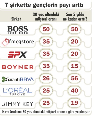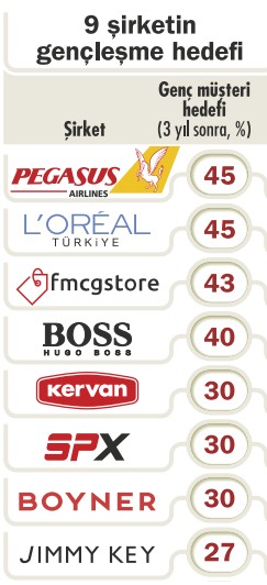 Bugün markaların hedefinde genç müşterilerin payını daha da artırmak bulunuyor. Spor mağazacılığında büyüyen SPX, iki yıl içinde genç müşteri oranını yüzde 35’ten yüzde 40’ın üzerine çıkarmayı hedefliyor. Watsons Türkiye ise genç müşteri segmentinin payı 3 yılda yüzde 50’nin üzerine çıkarmayı planlanıyor. Garanti BBVA 3 yılda 30 yaşın altındaki genç müşterilerin oranını yüzde 26’dan yüzde 32,5’e, Boyner ise 3 yılda genç müşteri kitlesinde yüzde 30 artış hedefliyor.