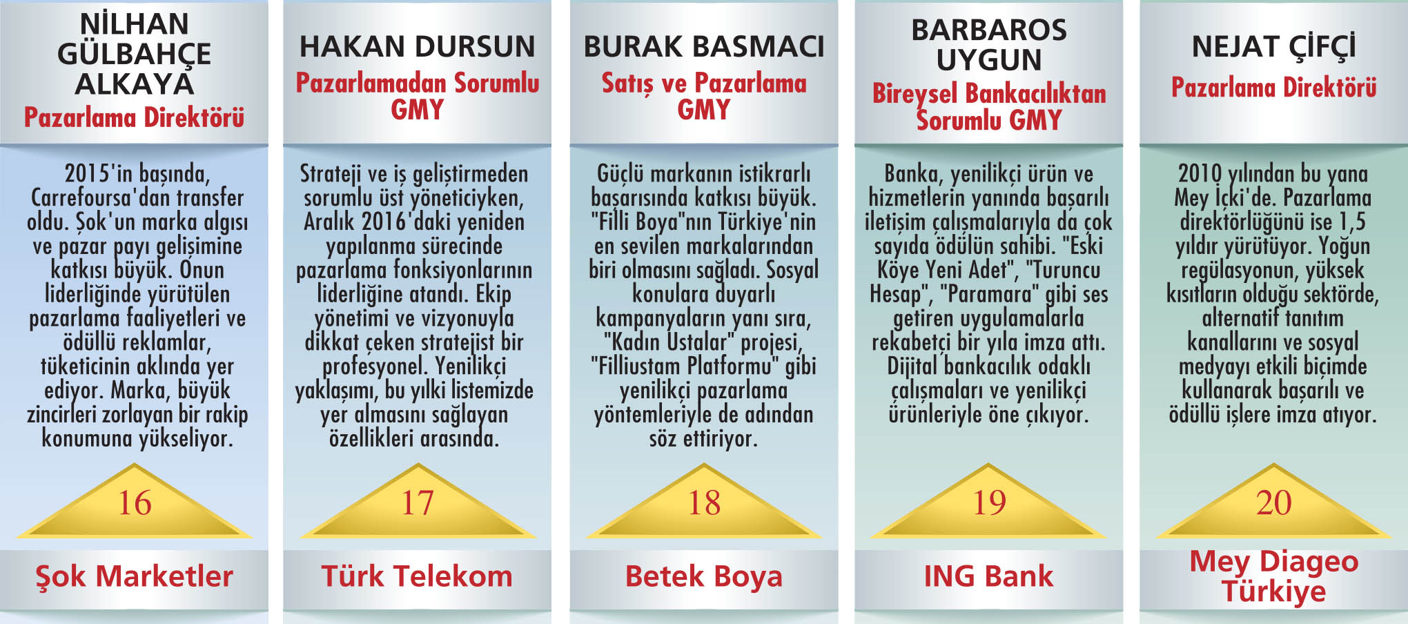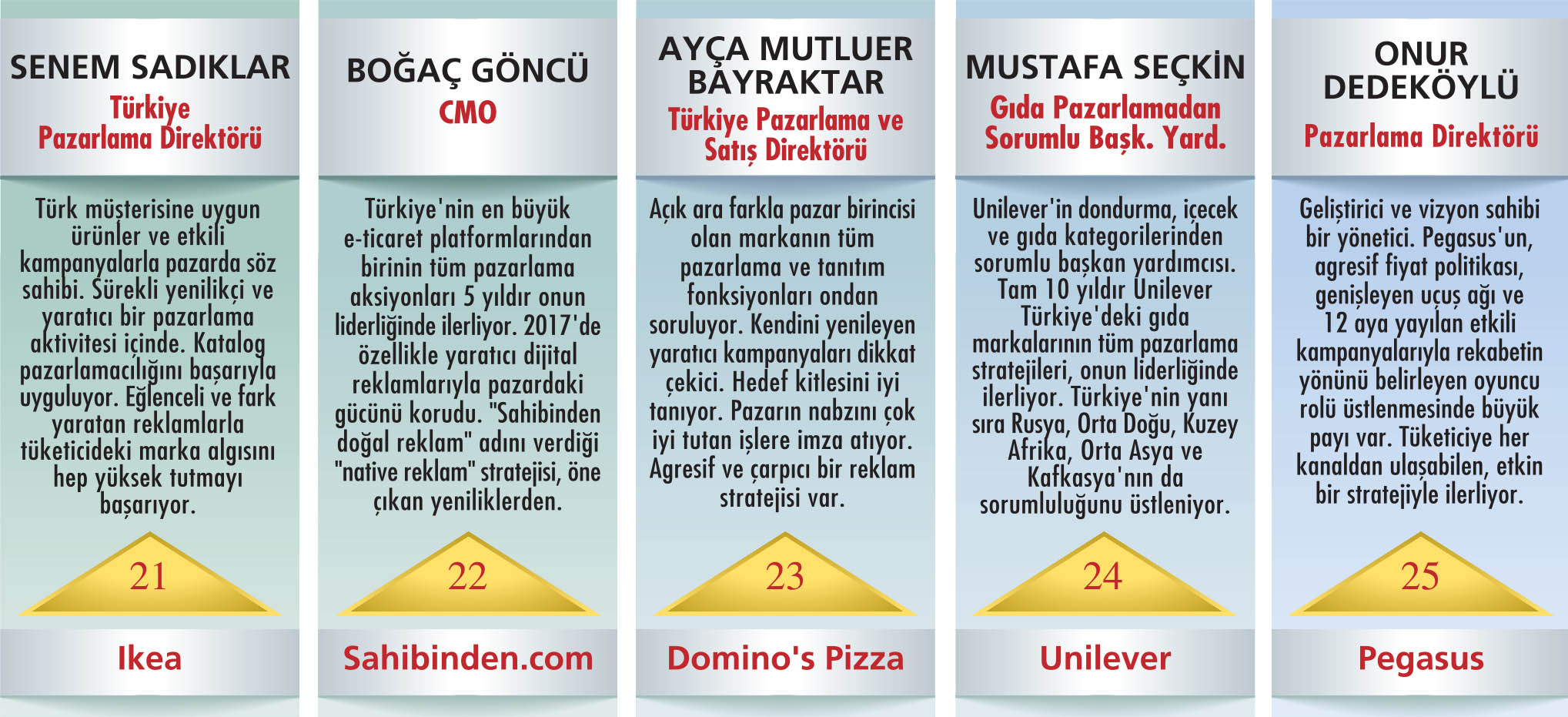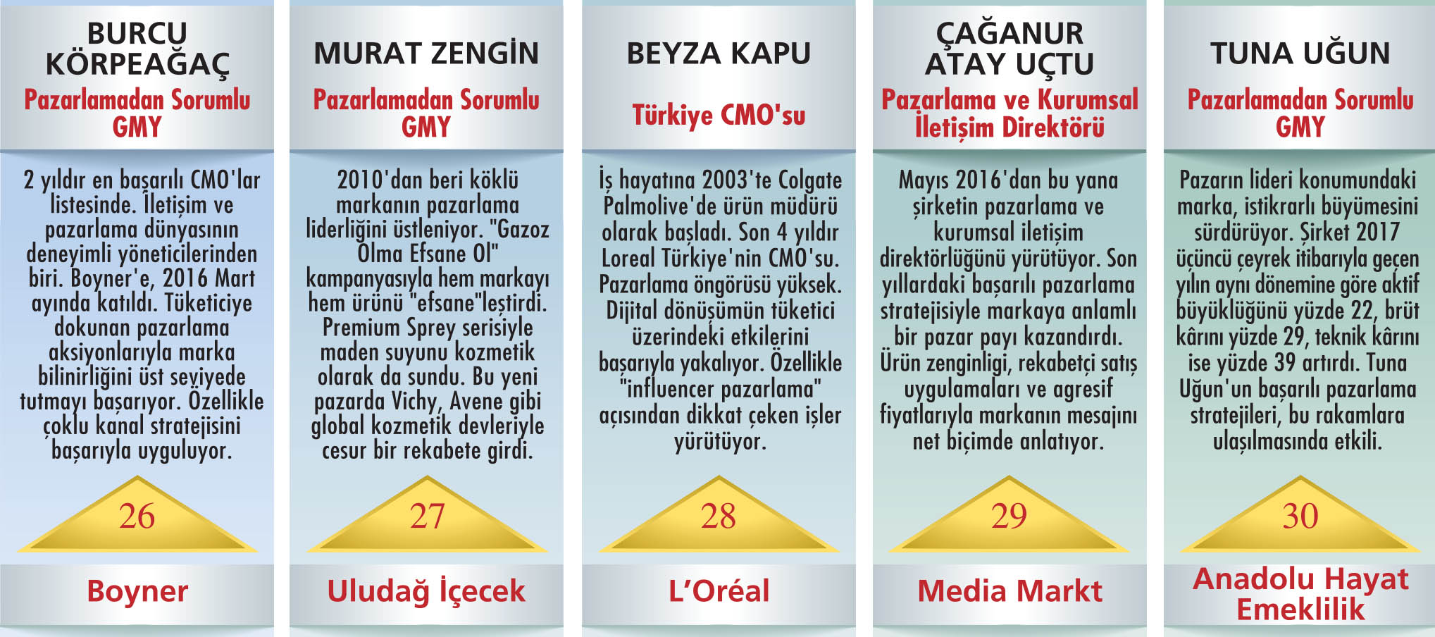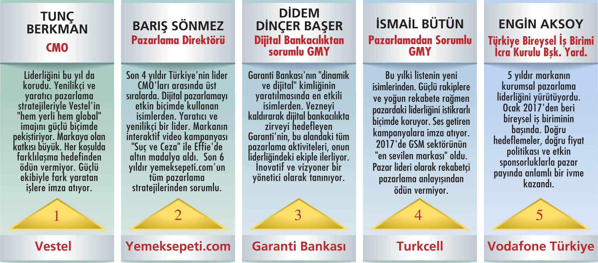 ARAŞTIRMA NASIL YAPILDI? * Pazarlama dünyasının önde gelen isimlerinin önerileriyle, 2017’deki pazarlama faaliyetleriyle öne çıkan 47 kişilik aday listesi belirlendi. * Aday listesindeki yöneticilerin “en az Ocak 2017 tarihinden bu yana görevde olması” gözetildi. Ocak sonrası göreve gelen yöneticiler listeye alınmadı. * Ankete dönüştürülen aday listesi, Türkiye’nin pazarlama konusunda önde gelen yöneticilerinden oluşan geniş bir kitle tarafından, web ortamı üzerinde oylandı. * Capital CMO Club ve CEO Club üyelerine de en beğendikleri ilk 5 pazarlama yöneticisi için kendileri ve grupları dışındaki adayları seçme şartıyla oy kullanma şansı verildi. * Anketin katılımcılarına, “2017’de başarılı bulduğunuz ilk 5 pazarlama yöneticisini önem sırasına göre işaretleyiniz ve ‘Bu ismi neden başarılı bulduğunuzu’ kısaca yazınız” denildi. * Anket katılımcılarına, kendi adaylarını ekleme hakkı da tanındı. (“diğer” seçeneğiyle) * Toplam 159 geçerli oyun kullanıldığı anket, ağırlıklı puan ortalaması kullanılarak değerlendirildi. Her bir adayın aldığı ağırlıklı puanlar, öne çıkan ilk 30 adayın aldığı toplam ağırlıklı puana oranlanarak oyların yüzdesel dağılımı hesaplandı. |