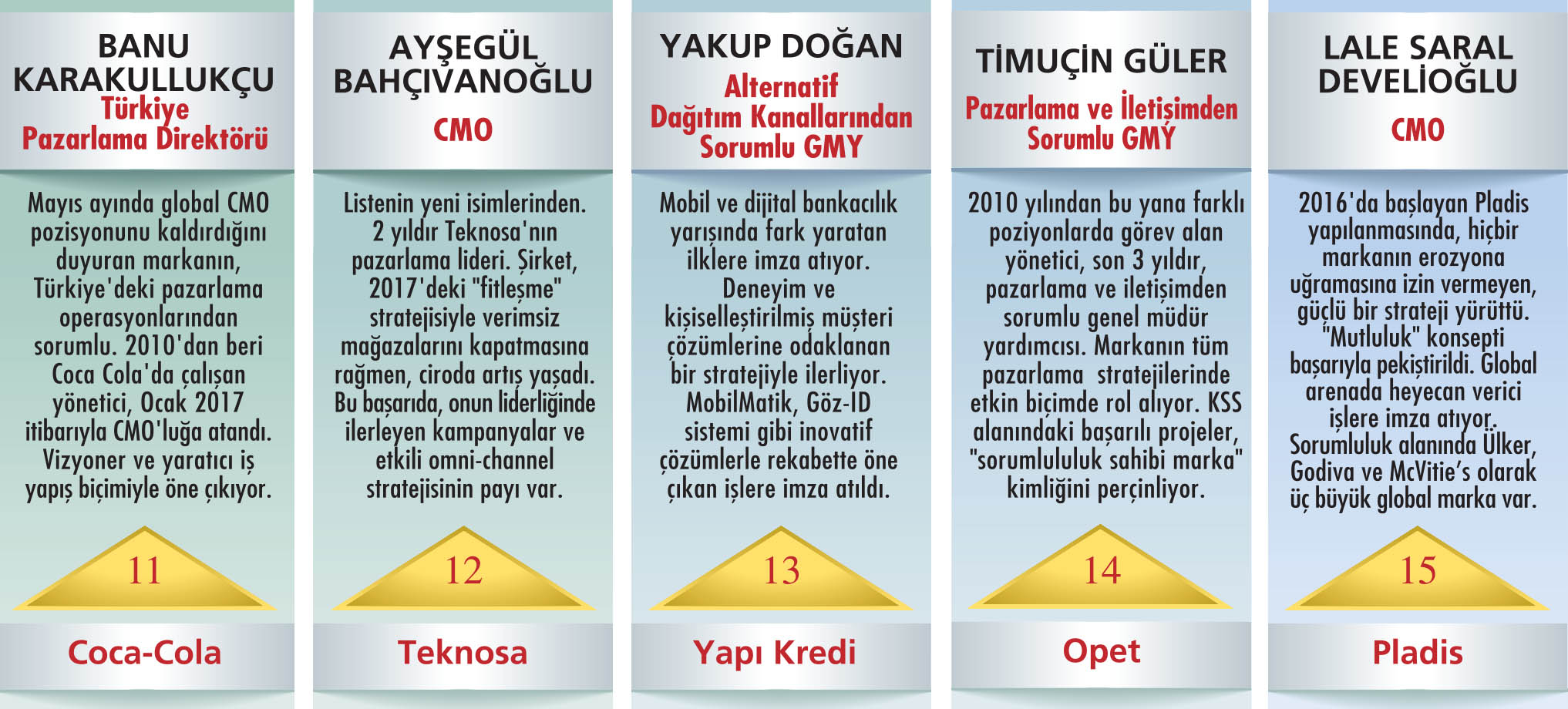 BAŞARILI 5 CMO NEYE ODAKLANACAK? PLADIS’İN DÖNÜŞÜMÜ Pladis Global Pazarlama Başkanı Lale Saral Develioğlu, 2018 planlarını şöyle özetliyor: “Marka vaadimizin merkezindeki mutluluk söylemiyle büyümeyi sürdüreceğiz. Özellikle Orta Doğu, Asya ve Afrika’nın en önemli oyuncularından biri olmayı hedefliyoruz. Çok hızlı büyüyen global bir oyuncu olarak pazarlama bütçemizi bir miktar daha artıracağız.” ULUDAĞ NE YAPACAK? Uludağ İçecek Pazarlamadan Sorumlu İcra Kurulu Üyesi Murat Zengin, iş stratejisinin parçası haline gelen konuları aktarıyor: “En önemli konu, ekonomik gelişmelerin tüketim alışkanlıklarına etkileri. Bu taraftaki gelişmeleri takip etmek önceliğimiz olacak. Odaklanacağımız 3 konu ise akıllı marka yatırımları, akıllı tüketici aktiviteleri ve akıllı araştırmalar.” YARATICI ATAK Mediamarkt Pazarlama ve Kurumsal İletişim Direktörü Çağanur Atay Uçtu, iş planını şu sözlerle özetliyor: “İlki ‘müşteri deneyiminde yaratıcılık’. Kendimizi çok sıkı ölçümler ve değerlendirme kriterleriyle donattık. İkincisi ‘dijitalde yaratıcılık’. Çoklu kanal yapımızı geliştireceğiz. Diğeri de ‘veri yönetiminde yaratıcılık’. Tüm mecralarda yenilikçi projeler hayata geçireceğiz.” İLKLER SÜRECEK Sahibinden.com CMO’su Boğaç Göncü, 2018’de takip edeceği konuları anlatıyor: “Organik ve direkt trafiğimizi artıracak SEO ve yeni üyelik ve dönüşüm çalışmaları önceliğimiz olacak. Hedeflerimiz, trafikte sürekli ve düzenli artış, ilan adetlerinde sürekli ve düzenli artış ve tüm segmentlerde, hem online deneyimde hem offline deneyimde sürekli iyileşme.” BETEK’İN STRATEJİSİ Betek Boya Satış ve Pazarlamadan Sorumlu Genel Müdür Yardımcısı Burak Basmacı, yeni pazarlama stratejilerine dair şu bilgileri veriyor: “En önemli gündem maddelerimiz dijitalleşme ve dijital platformlar. Bu konuda birçok inceleme yapıyoruz. Ülkemiz şartlarına uygun olarak hizmetlerimizi geliştireceğiz. Satış kanallarımızın geliştirilmesi konularına ağırlık vereceğiz.” |